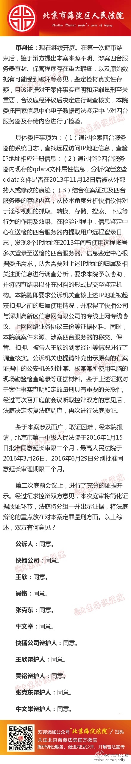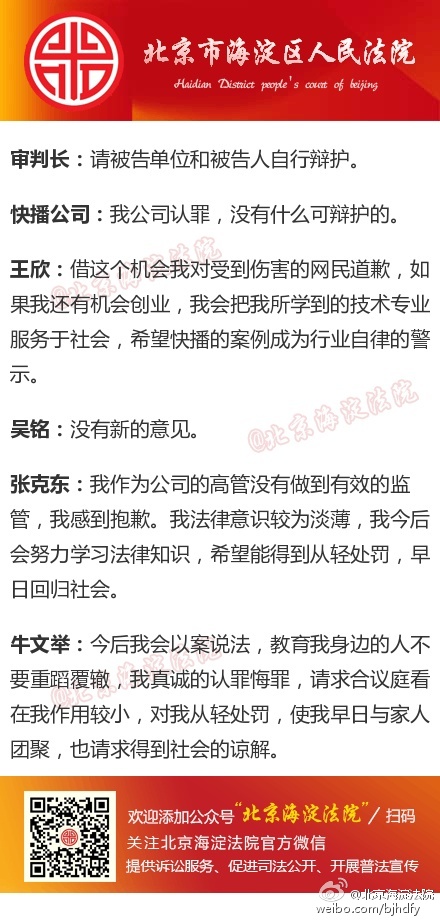 9月9日,北京市海淀區(qū)法院公開開庭審理深圳市快播科技有限公司,被告人王欣、吳銘、張克東、牛文舉涉嫌傳播淫穢物品牟利罪一案。根據(jù)北京海淀法院微博直播,快播及前CEO王欣均表示認罪,不辯護。