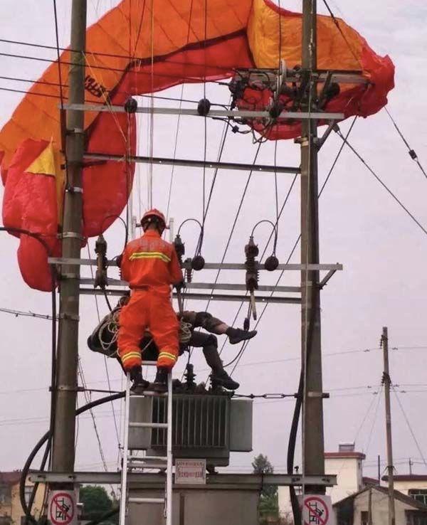 現(xiàn)場圖片顯示,一男子身上纏著繩索,繩索連著一只紅色滑翔傘,男子連同滑翔傘掛在高壓線上,已經(jīng)沒有反應(yīng);消防隊(duì)員站在高壓線變壓器邊對男子進(jìn)行解救。