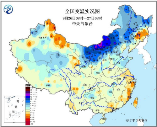 中央氣象臺今晨發(fā)布的消息稱,預(yù)計9月27日至29日,受冷空氣影響,中國中東部大部地區(qū)氣溫將自北向南下降4~6℃,其中,內(nèi)蒙古東部偏南地區(qū)、東北地區(qū)中南部降溫幅度可達8~10℃。內(nèi)蒙古中東部、東北地區(qū)南部、華北東部、黃淮東部等地的部分地區(qū)有5~6級風(fēng)。