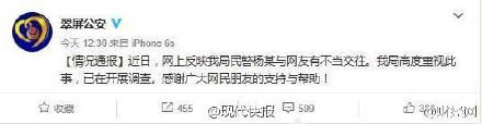 昨天下午,記者在楊某微博留言,對(duì)于網(wǎng)傳情況是否屬實(shí),楊某尚未作出回應(yīng)。同時(shí),記者多次致電宜賓市公安局翠屏分局,電話一直無(wú)人接聽(tīng)。目前,網(wǎng)友們的說(shuō)法尚未得到警方證實(shí)。