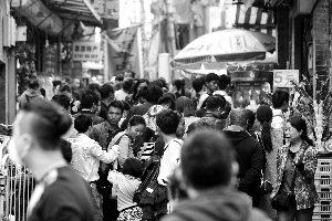 前日下午,位于前門(mén)的廊坊二條胡同中游人摩肩接踵。北京晨報(bào)記者 史春陽(yáng) 攝