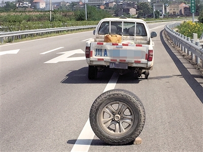 7日是國慶返程車流高峰,但駕駛員王某卻在回四川途中,在其駕駛的皮卡車右后輪跑脫后,并“就地取材”當(dāng)成警示牌,所幸沒有造成道路交通事故。