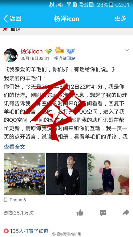 楊洋的網(wǎng)絡(luò)維護(hù)組9日在微博上發(fā)文提醒廣大的粉絲,“楊洋除微博賬號(hào)無(wú)其他社交平臺(tái)公開(kāi)賬號(hào)”,因?yàn)橛芯W(wǎng)友假冒楊洋的身份開(kāi)設(shè)假賬號(hào),甚至還獲得認(rèn)證,不只騙取粉絲大量錢(qián)財(cái),更以本尊的姿態(tài)發(fā)文,表示因?yàn)樽约禾,“?qǐng)?jiān)徫覜](méi)有時(shí)間來(lái)和你們互動(dòng)”,結(jié)果有不少粉絲誤以為是他本人而上當(dāng)受騙。