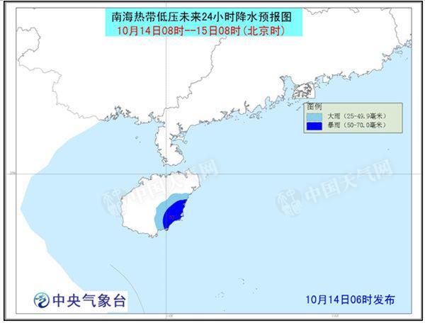 降水預(yù)報:14日08時至15日08時,受冷空氣和南海低壓殘余系統(tǒng)共同影響,海南島東南部還將有大雨或暴雨(50~70毫米)。