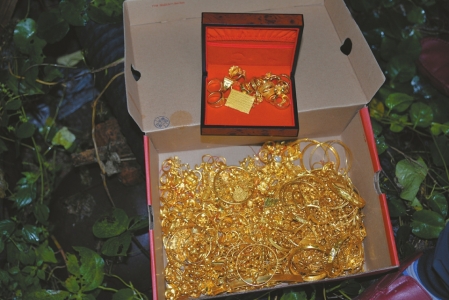 躲回老家48小時(shí)后,在黃某老家大邑,一個(gè)環(huán)形老宅背后的花園墻角處,龍泉公安民警拎出幾袋被盜黃金。