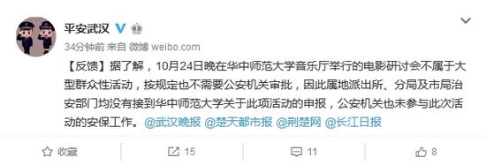 日前@平安武漢 表示這個(gè)鍋警察蜀黍不背![反饋]據(jù)了解,10月24日晚在華中師范大學(xué)音樂(lè)廳舉行的電影研討會(huì)不屬于大型群眾性活動(dòng),按規(guī)定也不需要公安機(jī)關(guān)審批,因此屬地派出所、分局及市局治安部門(mén)均沒(méi)有接到華中師范大學(xué)關(guān)于此項(xiàng)活動(dòng)的申報(bào),公安機(jī)關(guān)也未參與此次活動(dòng)的安保工作。@武漢晚報(bào) @楚天都市報(bào) @荊楚網(wǎng) @長(zhǎng)江日?qǐng)?bào)