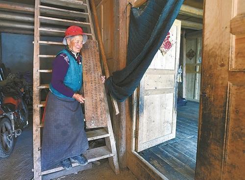 10月14日中午,松潘縣毛爾蓋上八寨鄉(xiāng)克藏村,80歲的仁青卓瑪坐在火爐旁,高原上的陽光透過窗戶照在她手里的木板上。