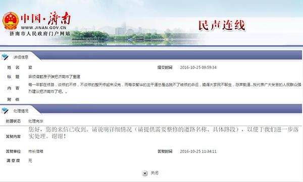這本是市民抱怨之辭,沒想到濟(jì)南市政府網(wǎng)站竟然回復(fù)了。內(nèi)容如下: