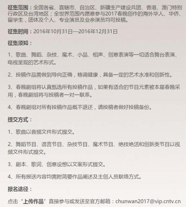 2017年央視春晚開始正式面向社會(huì)征集各類節(jié)目