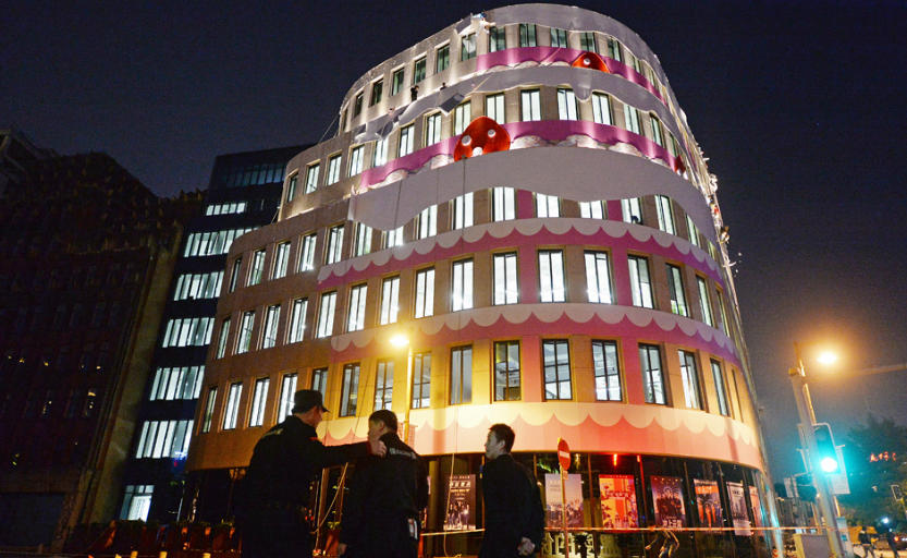 2016年11月2日,上海外灘,工人連夜拆除“蛋糕樓”外墻裝飾。近日,上海外灘附近出現(xiàn)了一棟8層“粉色蛋糕樓”,有專家指出其破壞了外灘建筑群的整體風格,并質(zhì)疑其違反了歷史文化風貌區(qū)的保護的相關(guān)條例。 澎湃新聞見習記者 賴鑫琳 圖