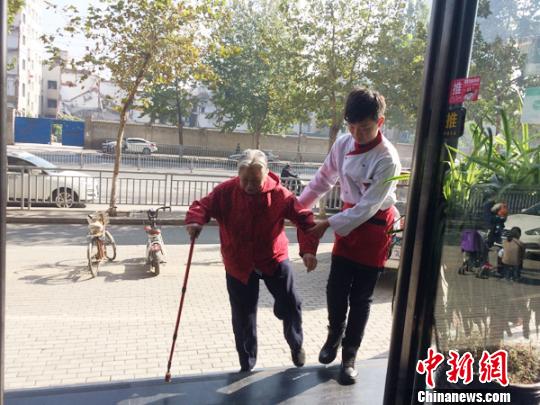 餐廳工作人員看到行動(dòng)不便的老人,便立刻前往大門外將老人攙扶至用餐地點(diǎn)。 王秋蘭 攝
