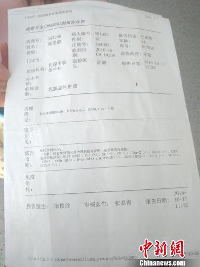 雯靜的診斷結(jié)果上赫然寫著:乳腺惡性腫瘤。 佘麗莎 攝