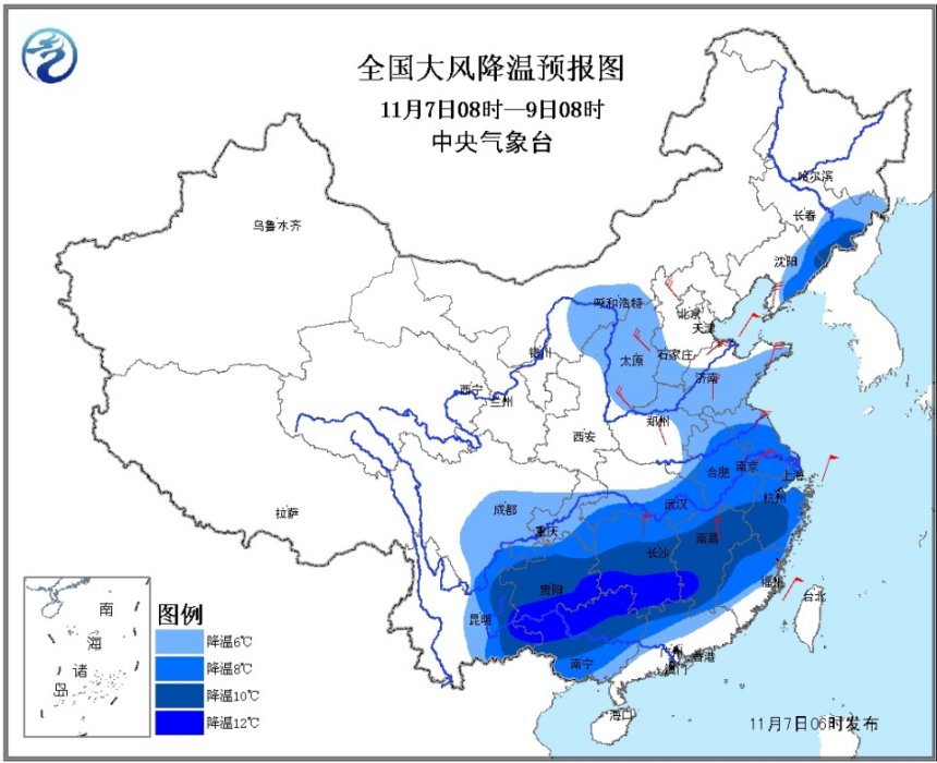 受強冷空氣影響,7日至9日,我國中東部地區(qū)將出現(xiàn)明顯的大風降溫天氣。南方大部地區(qū)氣溫將下降8~10℃,其中,江南中南部、華南北部、貴州、云南東部等地的部分地區(qū)降溫幅度可達10~12℃,局地12℃以上;東北地區(qū)東南部、華北西部和南部、黃淮東部等地的部分地區(qū)氣溫將下降6~8℃,局地降溫幅度可達10℃以上。上述大部地區(qū)將有4~6級風,陣風7級。我國東部和南部海區(qū)先后將有7~8級、陣風9~10級偏北風。