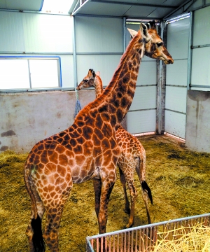 廣州日?qǐng)?bào)訊 (記者曾毅攝影報(bào)道)日前,經(jīng)過(guò)連續(xù)幾天的長(zhǎng)途運(yùn)輸,2只長(zhǎng)頸鹿寶寶來(lái)到了順德長(zhǎng)鹿童話動(dòng)物園,園方出動(dòng)一輛200噸級(jí)大吊車將長(zhǎng)頸鹿搬進(jìn)鹿鹿之家。