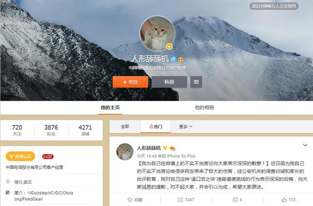 置 頂微博顯示:“我為自己在微博上的不實(shí)不當(dāng)言論向大家表示深深的歉意!近日因?yàn)槲易约旱牟粚?shí)不當(dāng)言論給很多網(wǎng)友帶來了極大的傷害,經(jīng)公安機(jī)關(guān)的調(diào)查訓(xùn)誡和 家長的批評教育,我對自己這種“逞口舌之快”違背道德底線的行為表示深深的后悔,向大家誠懇的道歉,對不起大家,并會引以為戒,希望大家原諒。