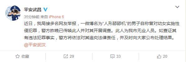 該網(wǎng)友說法是否屬實(shí)?長江日報記者從武昌警方獲悉,近日,該局接多名網(wǎng)友舉報,一微博名為“人形舔舔機(jī)”的男子自稱曾對幼女實(shí)施性侵犯罪。警方前晚已傳喚此人并對其開展調(diào)查。據(jù)查,此人為我市無業(yè)人員。