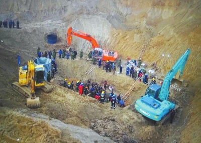 挖掘機緊張作業(yè),搜救人員在井口持續(xù)救援。