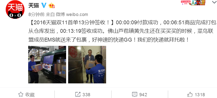 天貓2016年雙十一的第一單已經(jīng)簽收!從下單,到簽收,僅僅用了13分鐘!