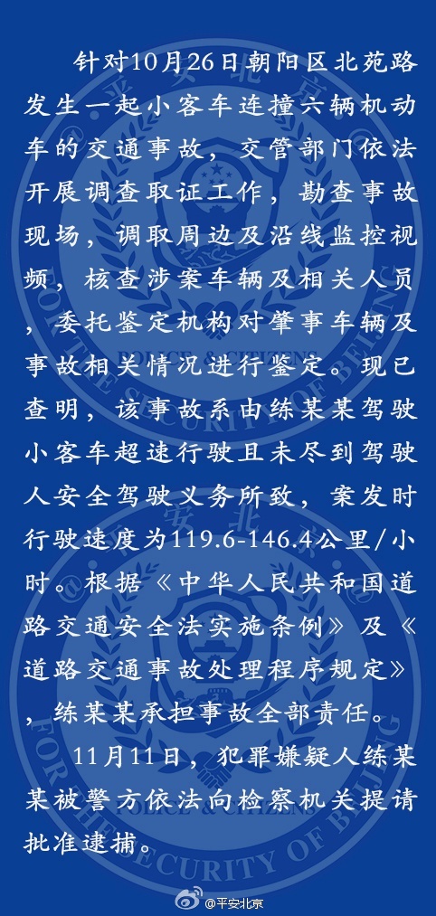 針對(duì)10月26日朝陽區(qū)北苑路發(fā)生一起小客車連撞六輛機(jī)動(dòng)車的交通事故,交管部門依法開展調(diào)查取證工作,勘查事故現(xiàn)場(chǎng),調(diào)取周邊及沿線監(jiān)控視頻,核查涉案車輛及相關(guān)人員,委托鑒定機(jī)構(gòu)對(duì)肇事車輛及事故相關(guān)情況進(jìn)行鑒定,F(xiàn)已查明,該事故系由練某某駕駛小客車超速行駛且未盡到駕駛?cè)税踩{駛義務(wù)所致,案發(fā)時(shí)行駛速度為119.6-146.4公里/小時(shí)。根據(jù)《中華人民共和國道路交通安全法實(shí)施條例》及《道路交通事故處理程序規(guī)定》,練某某承擔(dān)事故全部責(zé)任。