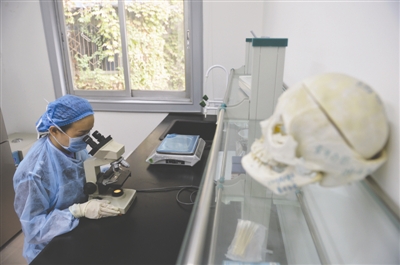 14日,成都市公安局青羊區(qū)分局,法醫(yī)張鵬雨正使用顯微鏡進行檢驗工作