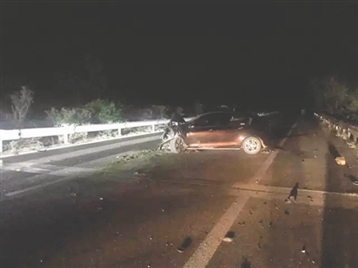 事故現(xiàn)場,一輛小轎車橫停在車道上