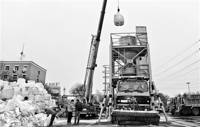 昨天下午5點半,北京青年報記者來到馬家樓橋附近的北京環(huán)衛(wèi)集團北京城市機掃公司,數(shù)十輛多功能除雪車正排隊灌裝融雪劑,做好上路除雪前的最后準備。這些車輛將根據(jù)最新氣象預報結果,在降雪來臨前的一小時左右到達指定清掃路段,應對今冬首場大雪。另外,北京環(huán)衛(wèi)集團昨晚約有360輛除雪車輛設備、730名環(huán)衛(wèi)人員備勤。
