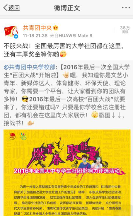 “不服來(lái)戰(zhàn)!全國(guó)最厲害的大學(xué)社團(tuán)都在這里……”近日,共青團(tuán)中央官方微博發(fā)布了這樣一條微博。