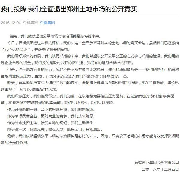 12月4日凌晨3時(shí)29分,石榴集團(tuán)微信公眾號(hào)發(fā)出這樣一則消息,“我們投降,我們?nèi)嫱顺鲟嵵萃恋厥袌?chǎng)的公開競(jìng)買”。