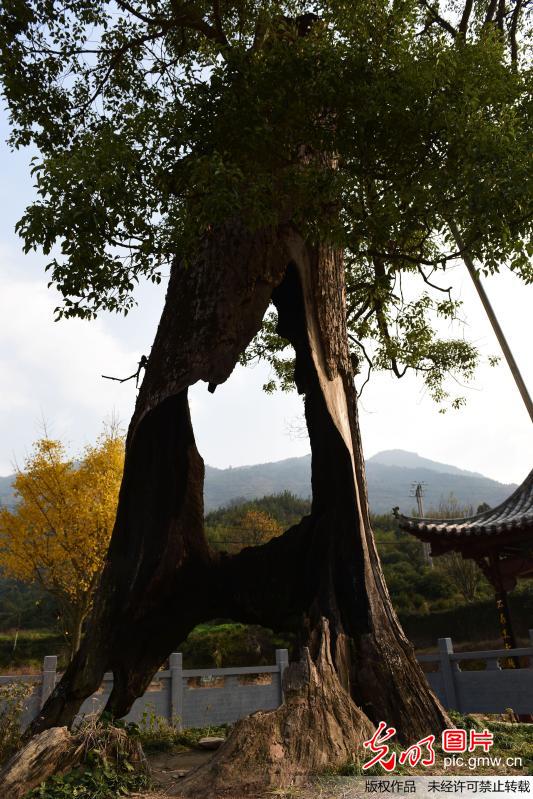 2016年12月4日,江西婺源縣浙源鄉(xiāng)嶺腳村被雷擊的'空心'古樟樹,被當(dāng)?shù)厝朔Q為'樹堅(jiān)強(qiáng)'。(胡敦煌攝/光明圖片)