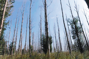 8月21日,在河北省張北縣國(guó)營(yíng)中心林場(chǎng),成片的楊樹(shù)已經(jīng)枯死