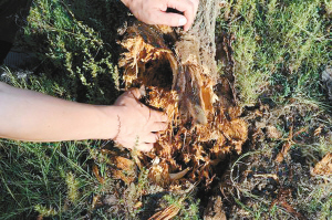 8月21日,在河北省張北縣張化線一側(cè)的楊樹(shù)林,一棵已經(jīng)枯死的楊樹(shù)樹(shù)根已經(jīng)腐爛