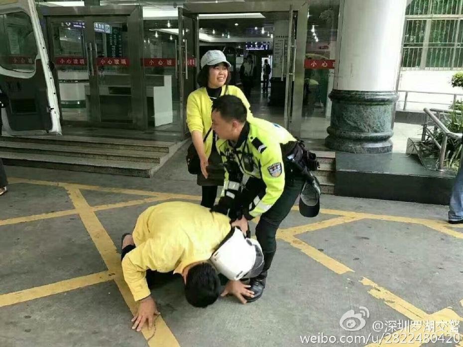 12月4日下午,深圳鐵騎隊(duì)成功護(hù)送一危急病人到達(dá)留醫(yī)部搶救室,病人家屬下跪感謝。圖片來源:深圳羅湖交警官微