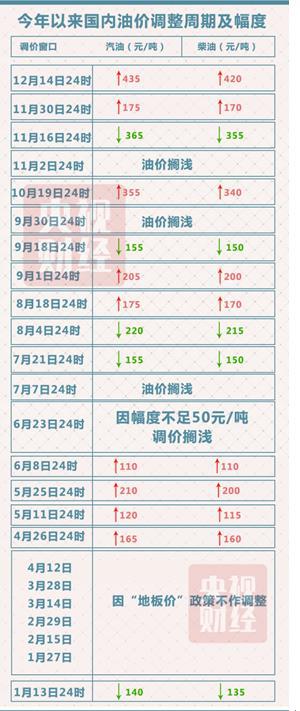 (央視財(cái)經(jīng)記者 平凡 張婷敏)12月14日24時(shí),國(guó)內(nèi)成品油第24次調(diào)價(jià)窗口再次開啟。受產(chǎn)油國(guó)15年來(lái)首次聯(lián)手減產(chǎn)影響,國(guó)內(nèi)油價(jià)將迎來(lái)年內(nèi)第九次上調(diào)。記者剛剛從國(guó)家發(fā)改委獲悉:汽油每噸將上調(diào)435元,柴油每噸將上調(diào)420元。