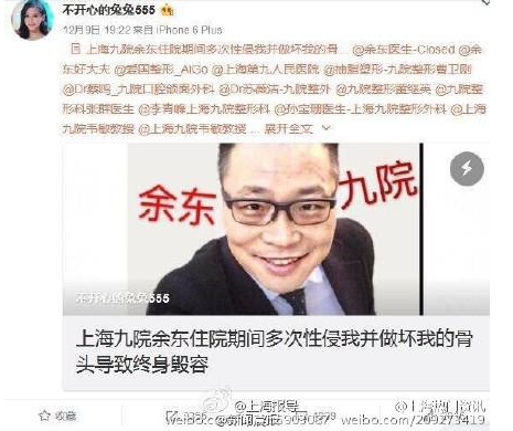 11日,微博名叫“不開(kāi)心的兔兔555”(以下簡(jiǎn)稱(chēng)兔兔)的網(wǎng)友報(bào)料稱(chēng),她曾被上海交通大學(xué)醫(yī)學(xué)院附屬第九人民醫(yī)院的醫(yī)生余某“性侵”。
