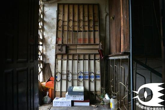 案發(fā)現(xiàn)場(chǎng)501室住房房門被鄰居用紙殼和鐵門擋住。