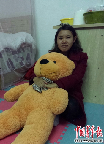錢仁鳳坐在宿舍里,抱著男友送給她的毛絨熊。李雅娟/攝