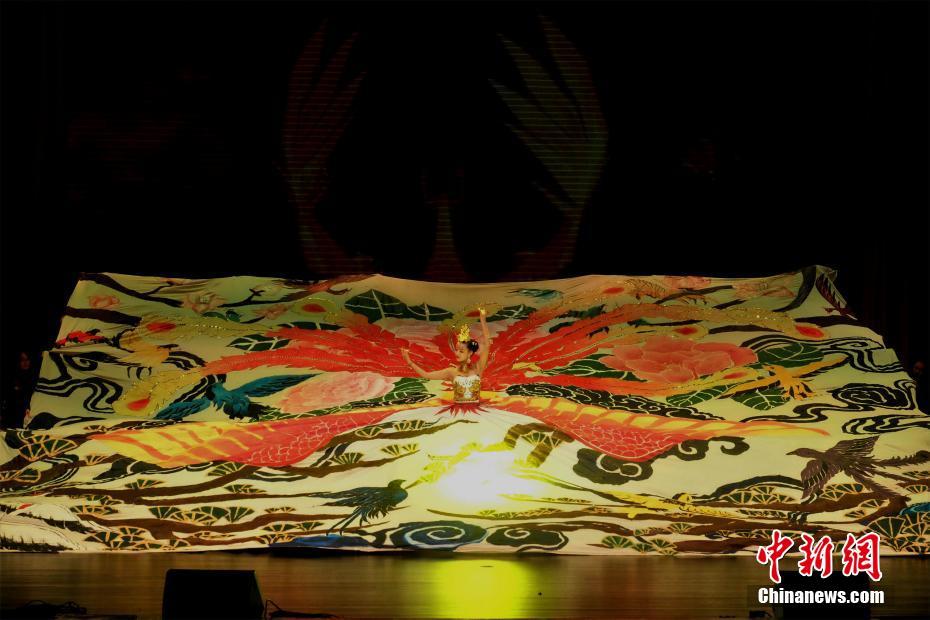 近日,在重慶理工大學(xué)會計(jì)學(xué)院年度頒獎典禮暨文藝晚會上,當(dāng)晚壓軸出場的舞蹈《百鳥朝鳳圖》,令現(xiàn)場千余名師生贊嘆不已,發(fā)布到網(wǎng)上后火爆了微信朋友圈。據(jù)了解,該作品是重慶理工大學(xué)三名95后女大學(xué)生純手工打造的,從設(shè)計(jì)到制作共歷時(shí)兩個月時(shí)間,從討論到設(shè)計(jì)定稿、畫圖上色、縫制金線,再到成衣,這件《百鳥朝鳳圖》裙擺長約9米、寬約8.5米,以人身為鳳頭,裙擺為鳳翼,展開就宛如浴火重生的鳳凰一般。鐘欣 攝