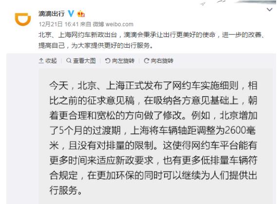 細則出臺后,各大網(wǎng)約車平臺第一時間做出了應(yīng)對。滴滴官方的公告看起來十分樂觀,“相比之前的征求意見稿,網(wǎng)約車實施細則在吸納各方意見基礎(chǔ)上,朝著更合理和寬松的方向做了修改。”而神州的回應(yīng)則略顯無奈,“北京、上海公布的網(wǎng)約車新政跟之前的征求意見稿相比變化不大”,還表示會跟有關(guān)管理部門保持溝通。
