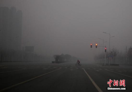 1月1日,霧霾籠罩下的河南鄭州城區(qū)。中新社記者 王中舉 攝