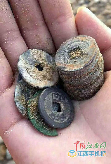 近日,江西新干縣三湖鎮(zhèn)曾坊村旁的贛江沙灘上,挖出大量古錢幣和寶劍,引發(fā)村民哄搶。這些錢幣大小各異,大部分都已泛起銅綠,有的還與黃泥牢牢地粘在一起,看上去年代已非常久遠。經(jīng)過水洗之后,可以發(fā)現(xiàn)上面寫有“乾隆通寶”等字樣。