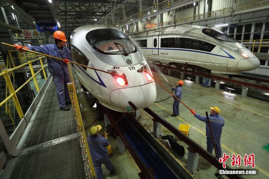 1月8日晚,一列和諧號高鐵列車緩慢駛?cè)肷虾:鐦騽榆囘\用所,車頭部分沾滿了厚厚的“霧霾妝”,在列車入庫前除了對外皮自動清洗外,車頭部分還需人工特別精洗“卸妝”,一趟400米的長編列車清洗完畢大約需要45分鐘,每組工人一晚要清洗20多個“霧霾車頭”,直到清晨。圖為工作人員為高鐵車頭洗刷刷。中新社記者 張亨偉 攝