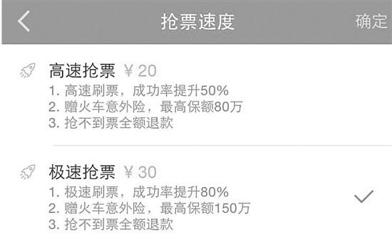 在“攜程旅行”上,根據(jù)搶票速度,高速搶票的價(jià)格為20元/份,顯示搶票成功率是49.2%,而極速搶票為30元/份,搶票成功率是55.2%,此外,也有不加價(jià)的低速搶票,但標(biāo)注了“成功率較低”,搶票成功率只有30%。