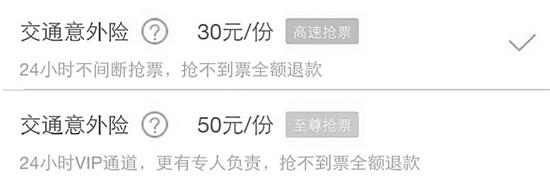 和前面兩個(gè)網(wǎng)站相比,“藝龍旅行”隱晦一些,它的搶票服務(wù)涵蓋在“交通意外險(xiǎn)”套餐內(nèi),供大家自由選擇,購買20元/份的“交通意外險(xiǎn)”,對應(yīng)“快速搶票”,購買30元/份的“交通意外險(xiǎn)”,對應(yīng)“高速搶票”,購買50元/份的“交通意外險(xiǎn)”,對應(yīng)“至尊搶票”,套餐價(jià)格越高,可享受的搶票服務(wù)越好。