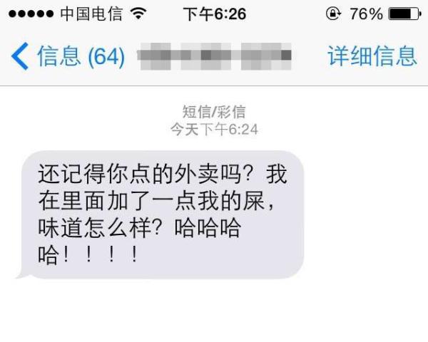 李女士稱,本以為事件就此結(jié)束,誰知隔了4個多月,她收到一條159開頭的手機號發(fā)來的短信:“還記得你點的外賣嗎?我在里面加了一點我的屎,味道怎么樣?”李女士稱,收到后其立即向“餓了么”平臺投訴,并將短信截圖后通過微博發(fā)布。