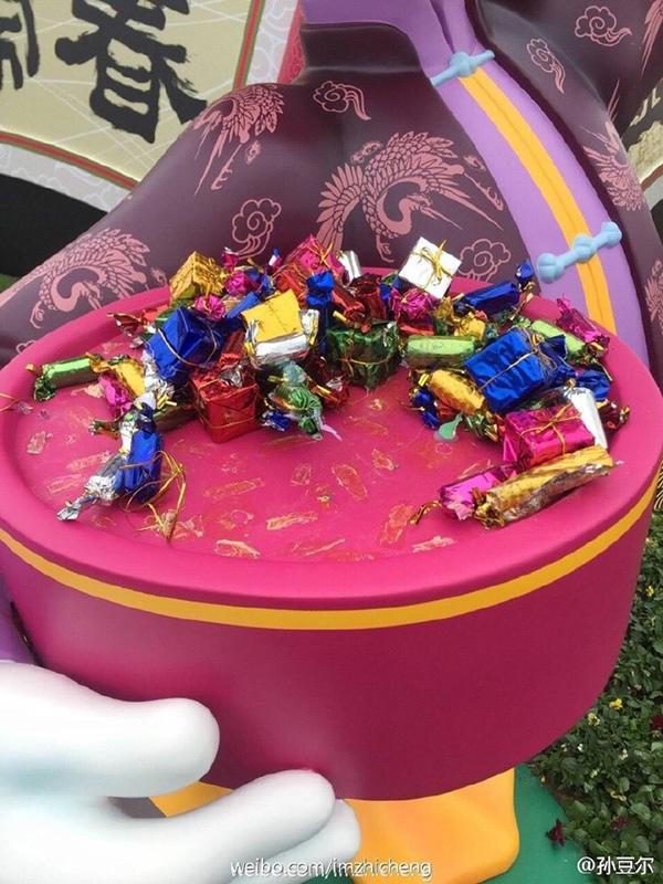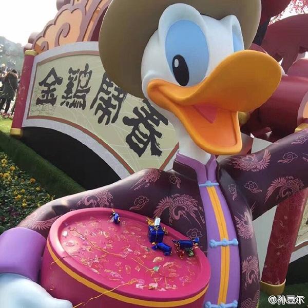 近日,微博網(wǎng)友 @孫豆?fàn)柋,由于春?jié)將至,上海迪士尼在城堡前弄了一個“金雞鬧春”的景觀供游人互動拍照。本來是挺好的一件事,偏偏有人把唐老鴨手上的糖果弄下來拿走了!