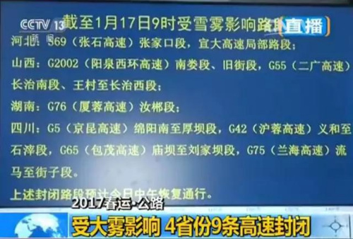 受大霧和降雪的影響,截至今天上午9點(diǎn),全國(guó)4省市9條高速路段封閉。包括河北張石公路張家口段、宣大高速局部路段;山西陽(yáng)泉西環(huán)高速南婁段、舊街段,二廣高速長(zhǎng)治南段;湖南蓉廈高速汝郴段;四川京昆高速、滬蓉高速、包茂高速、蘭海高速的部分路段。