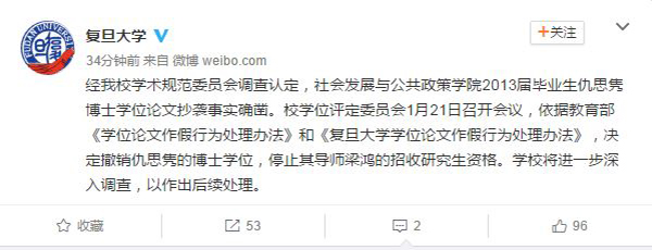 1月17日21時50分許,復(fù)旦大學(xué)官方微博就“抄襲門”發(fā)布回應(yīng):“關(guān)于媒體報道的我校社會發(fā)展與公共政策學(xué)院畢業(yè)生仇思雋涉嫌博士論文抄襲一事,我校學(xué)術(shù)規(guī)范委員會此前已接到相關(guān)舉報并啟動了調(diào)查程序。目前,相關(guān)調(diào)查正在進行中。如抄襲情況認(rèn)定屬實,學(xué)校將依據(jù)《復(fù)旦大學(xué)學(xué)術(shù)規(guī)范實施條例》作出嚴(yán)肅處理。”