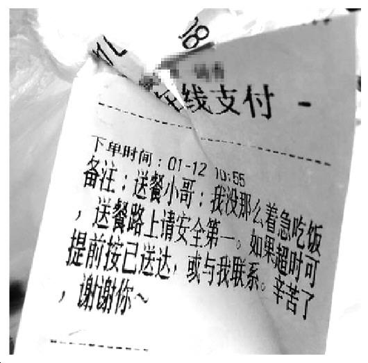 一名顧客在所點外賣小票“備注”欄中寫道:“我沒那么著急吃飯,送餐路上請安全第一。如果超時可提前按已送達……”