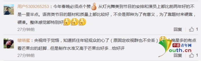 網(wǎng)友“小小萌兒V”留言:其實也還不錯 有幾個小品挺不錯的 閆學(xué)晶 沈騰 這兩個是最喜歡的 今年的歌舞感覺特別好?傊 各位春晚的工作人員辛苦了,新年快樂 ;而網(wǎng)友“誒嘿嘿DING”留言:今年春晚贊贊贊,舞美特效很棒,美女帥哥多(尤其帥哥養(yǎng)眼哈哈),小品相聲多(雖然有些比較尷尬,但總的來說質(zhì)量還可以),而且有很多點能看出來特別用心,香港回歸20周年,航天英雄,中國傳統(tǒng)文化國粹戲曲,還有中國數(shù)不盡的大好山川江河。