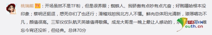 對于整場春晚來講,也有網(wǎng)友發(fā)表了自己的看法。網(wǎng)友“桃瑞熊”表示:開場雖然不是TF粉,但是很養(yǎng)眼;蜘蛛人、我驕傲有點吵有點亢奮;好賤嘻哈根本沒印象;蔡明還挺逗,想死你們了也還行;滑稽戲恕我北方人不懂。鮮肉總體陽光清新,瑯琊唱功不凡,顏值很高。三軍儀仗隊航天英雄值得敬佩。成龍大哥是一晚上最讓人感動的,永遠的大哥!難忘今宵還沒聽,但經(jīng)典?傮w70分。
